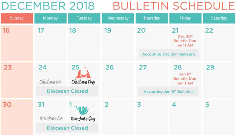 Diocesan offices will be closed December 24th and 25th for Christmas, and December 31 and January 1 for New Years.