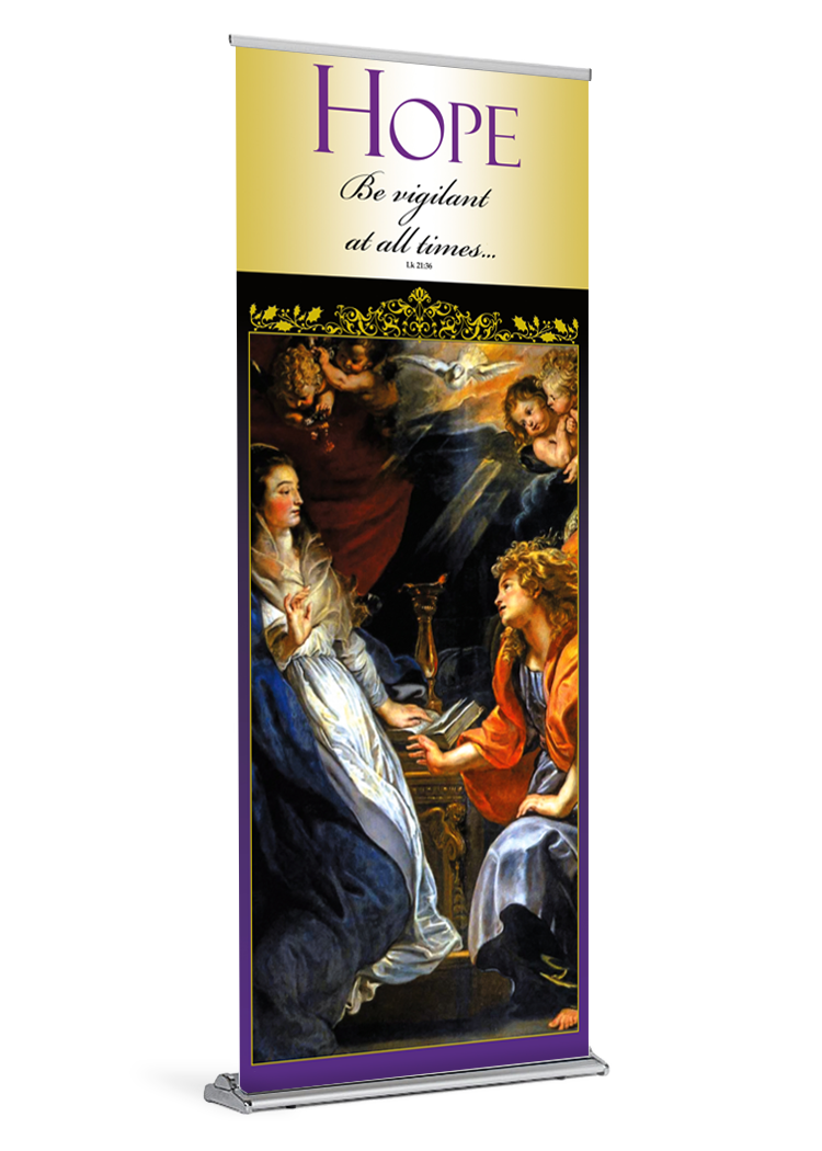 If you ordered a banner with your stand the banner will come installed and ready be displayed. All you need to do is insert the pole and pull the banner up. If your parish already owns a stand, your banner will arrive with a bottom rail that is quick and easy to slide into your stand.