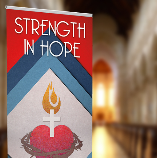 Place a banner in a high traffic area so parishioners can be reminded to have strength in hope while protecting the freedom of religion.